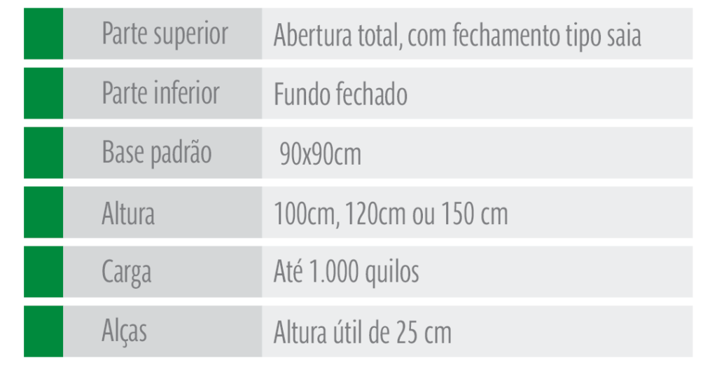 Internamente, é revestido por uma embalagem plástica, denominada de liner (composta por Polietileno de Baixa Densidade), que tem como função garantir o bom armazenamento e transporte do resíduo, evitando possíveis vazamentos.  Possui 4 alças, que permitem sua movimentação por empilhadeira, não necessitando a utilização de paletes. Ideal para o transporte de resíduos sólidos ou pastosos, substitui com vantagens outras formas de armazenamento, como por exemplo, os tambores metálicos de 200L.
